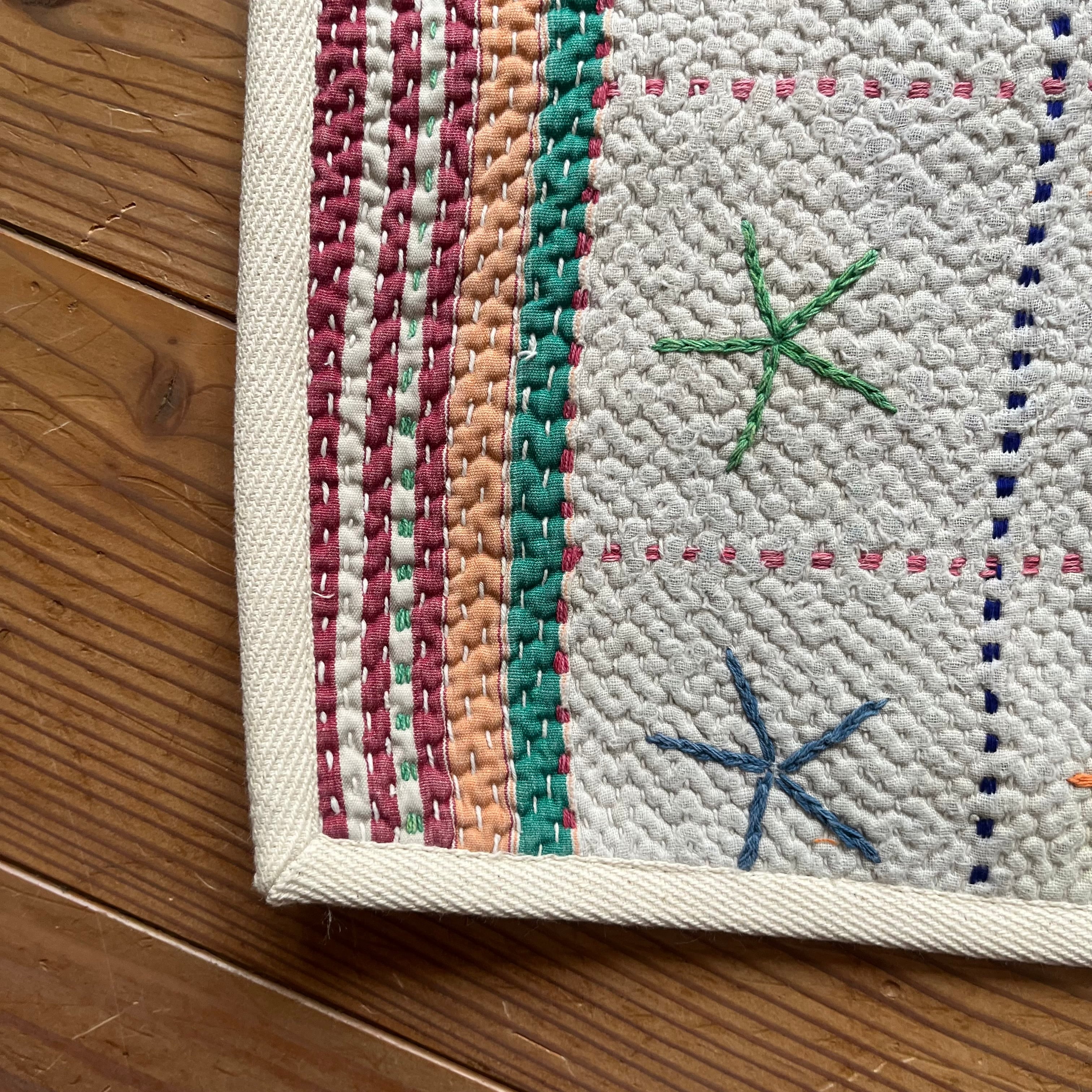 インドで買い付けたヴィンテージラリーキルトをハリコットアトリエで使いやすいサイズにカットしました。