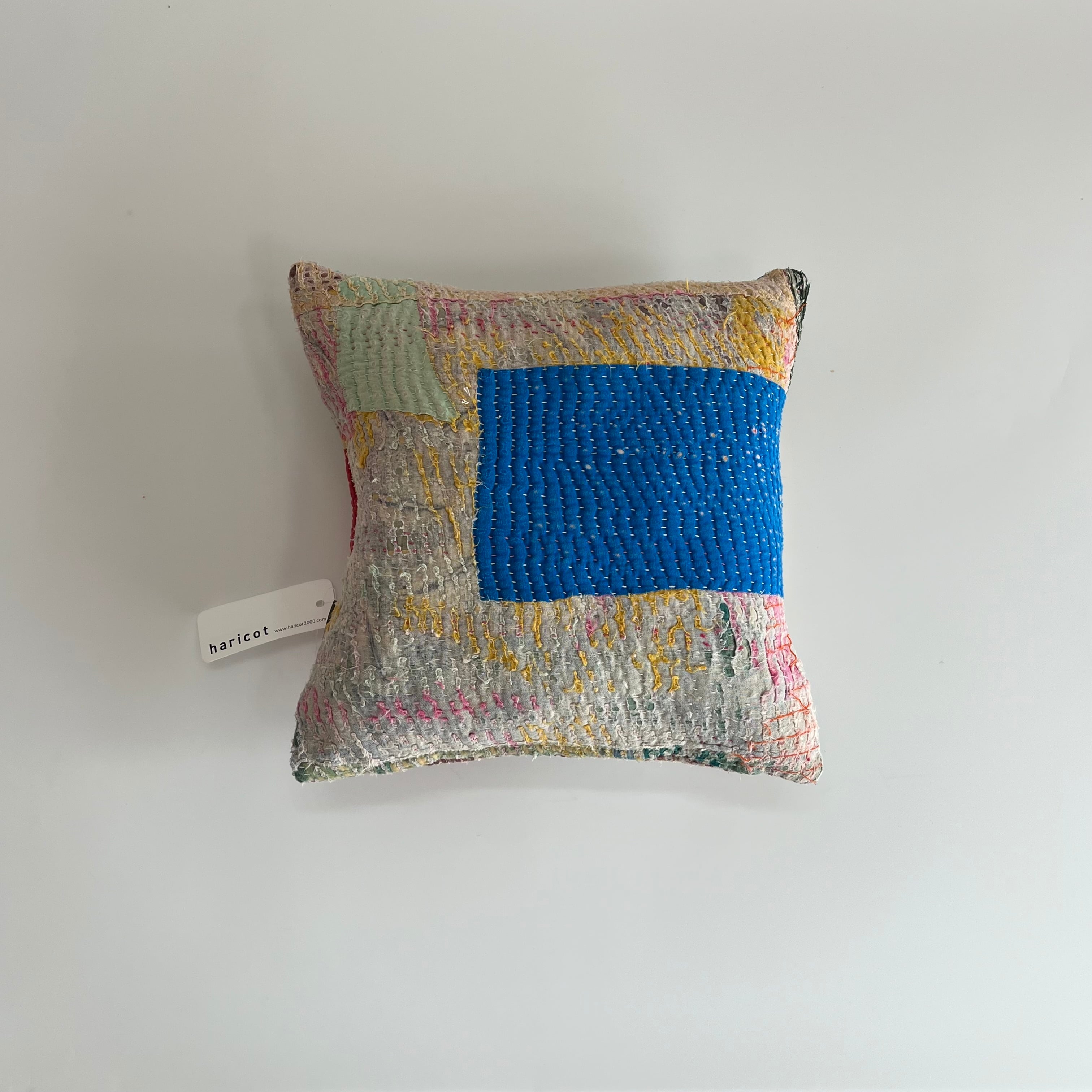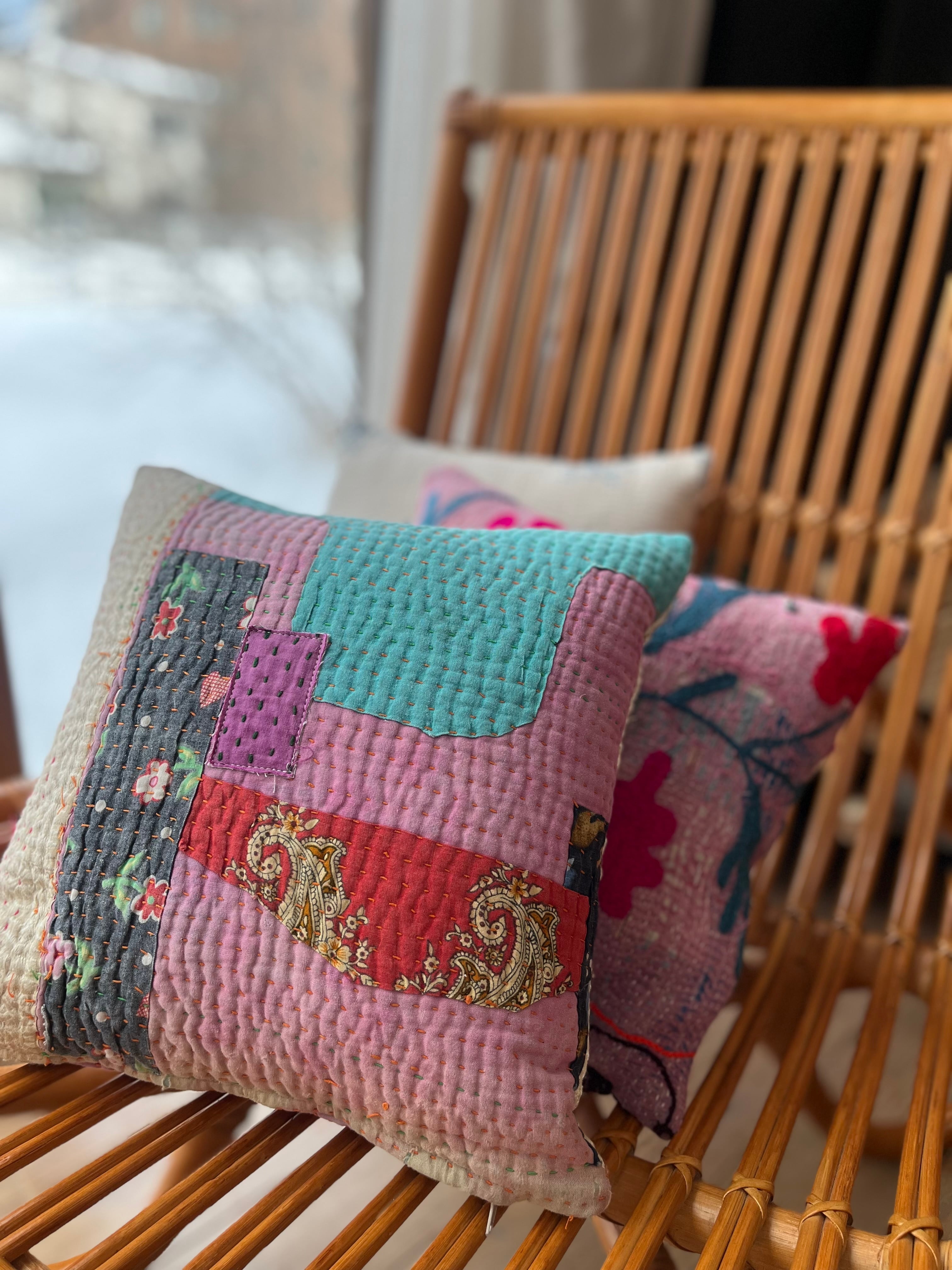 インドで買い付けたヴィンテージラリーキルトをアトリエでクッションに仕立てました。