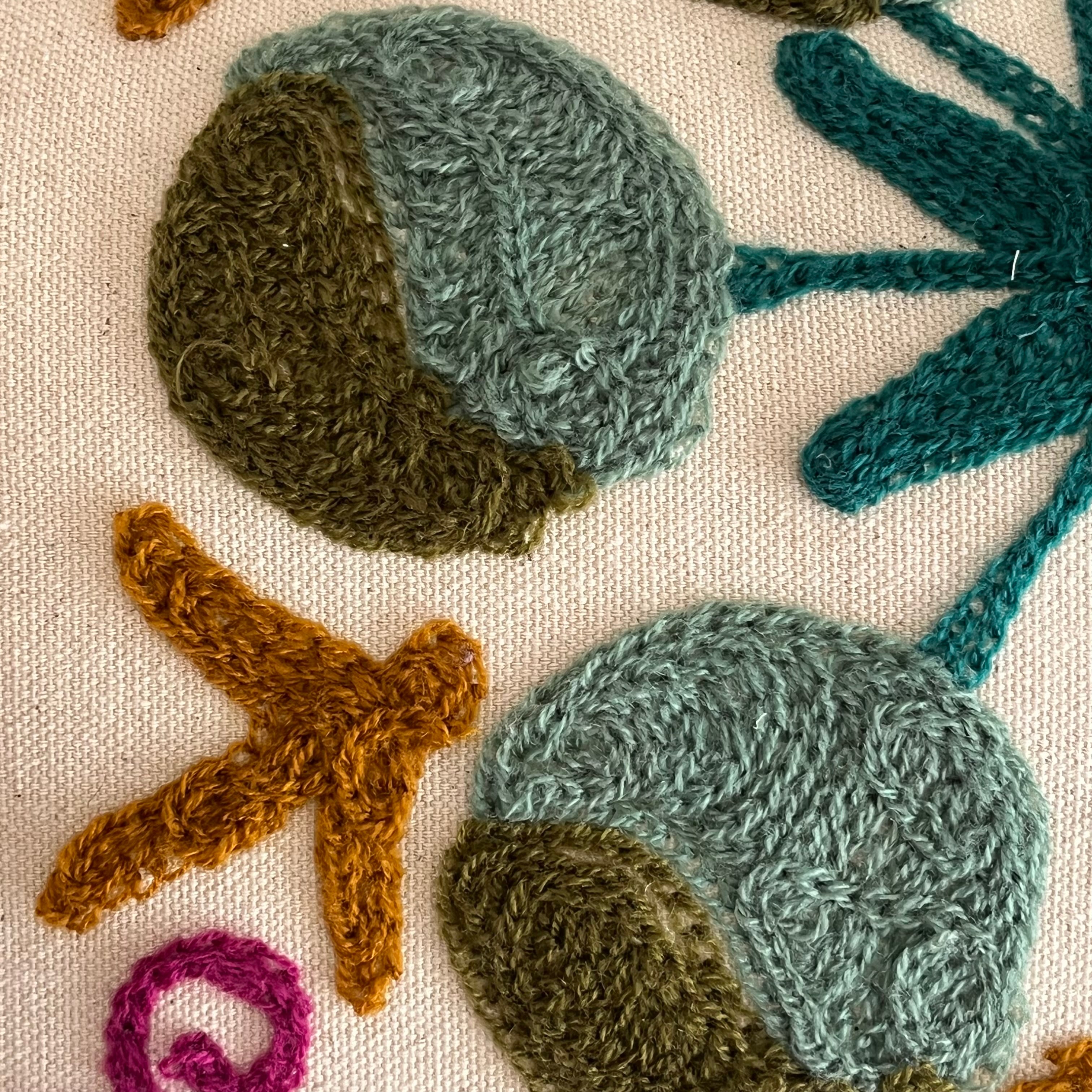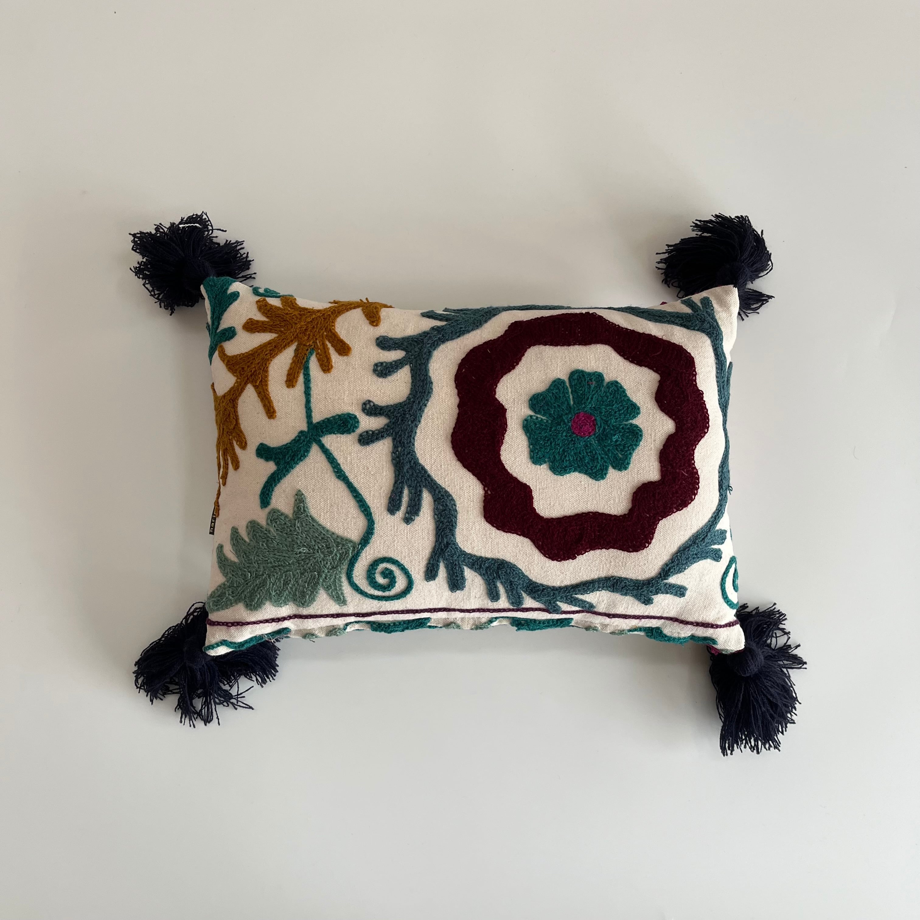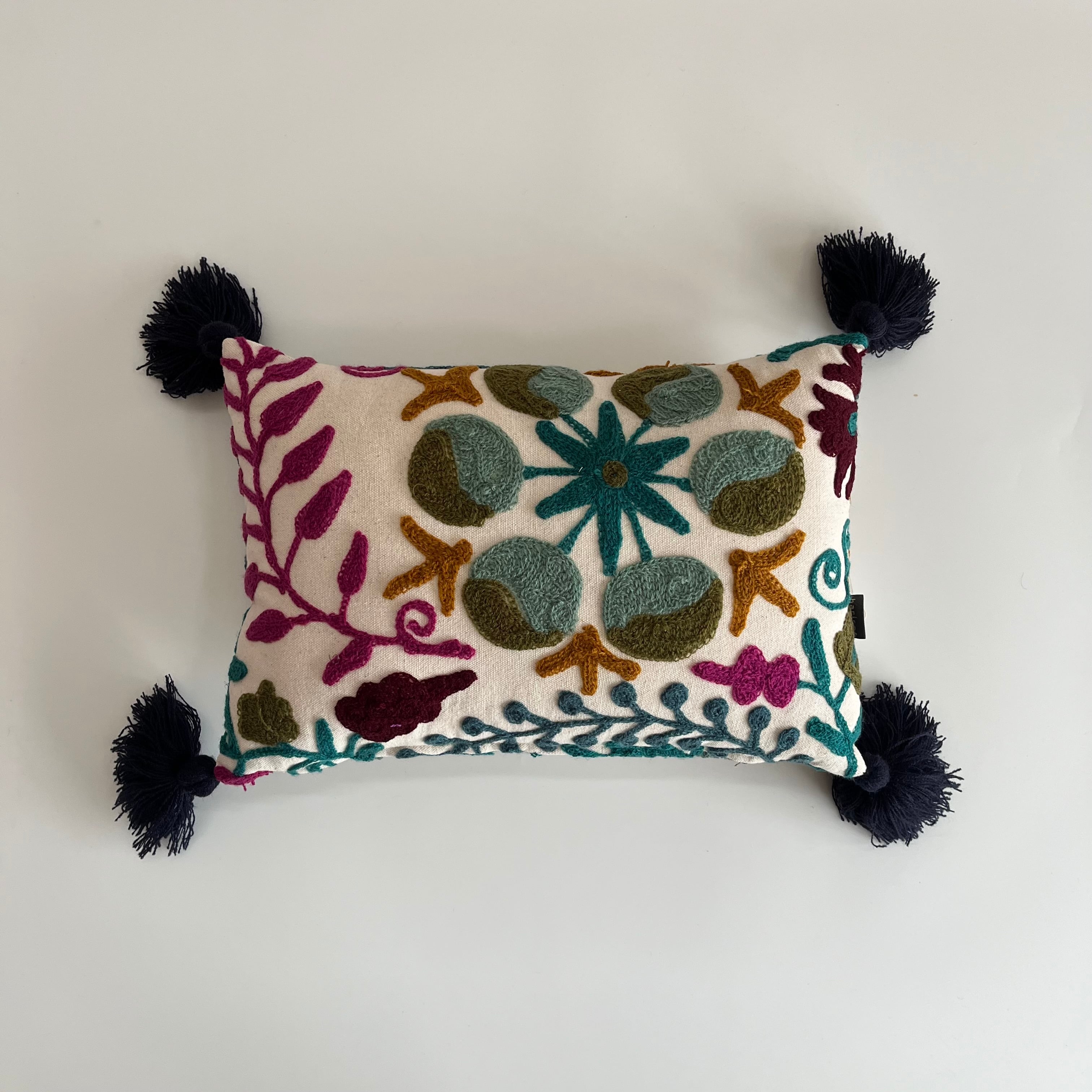 インドで買い付けたスザニ生地ををアトリエでクッションに仕立てました。
