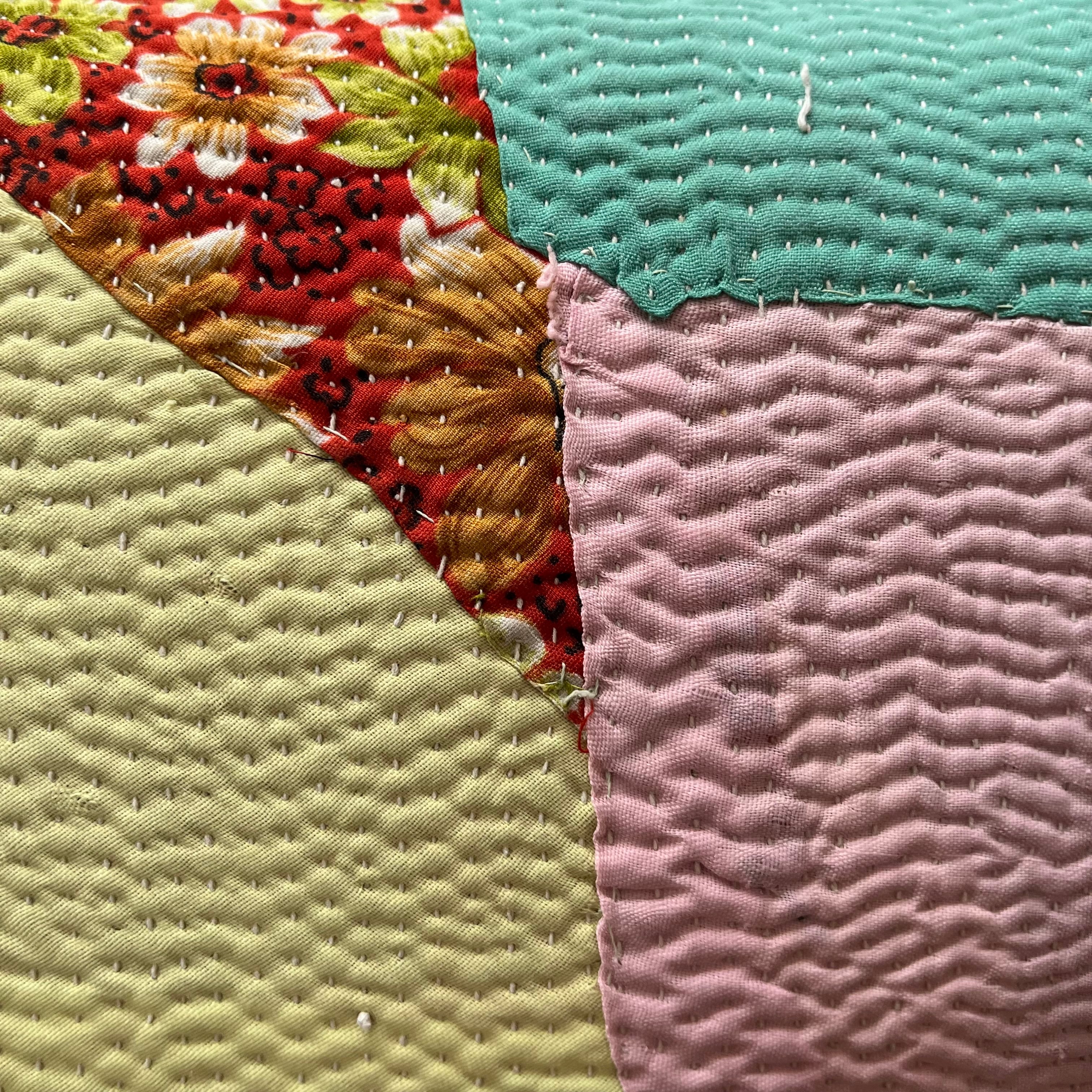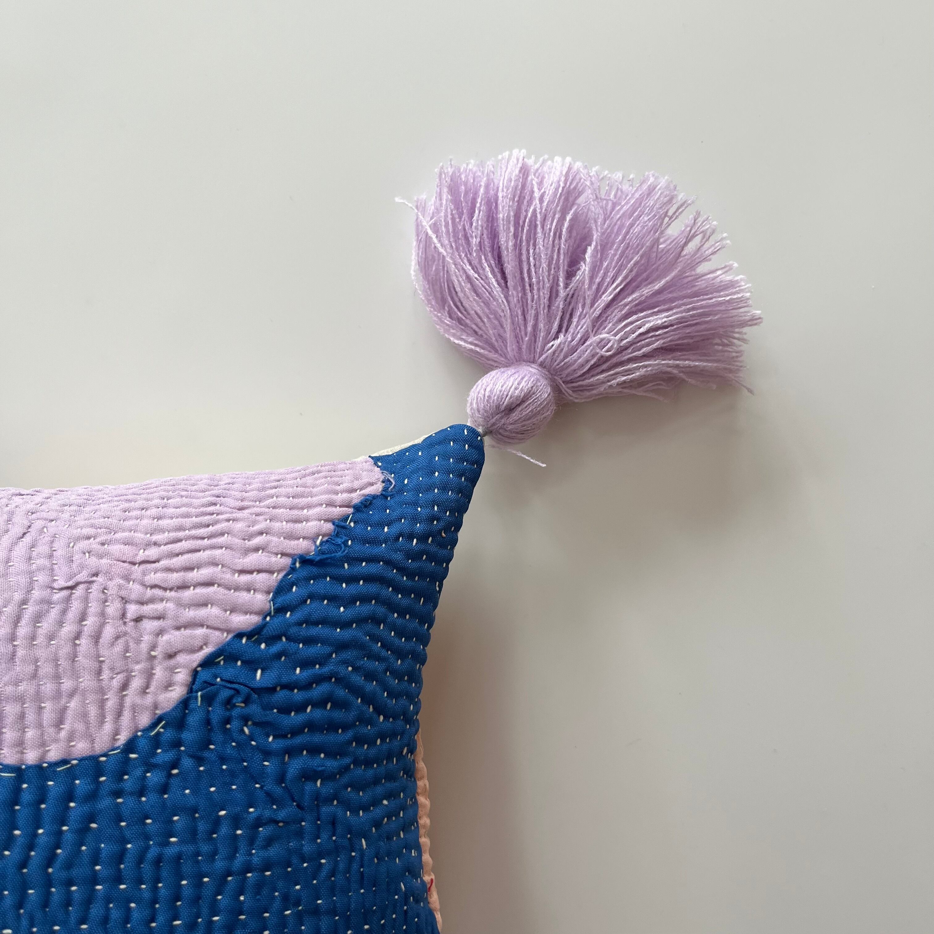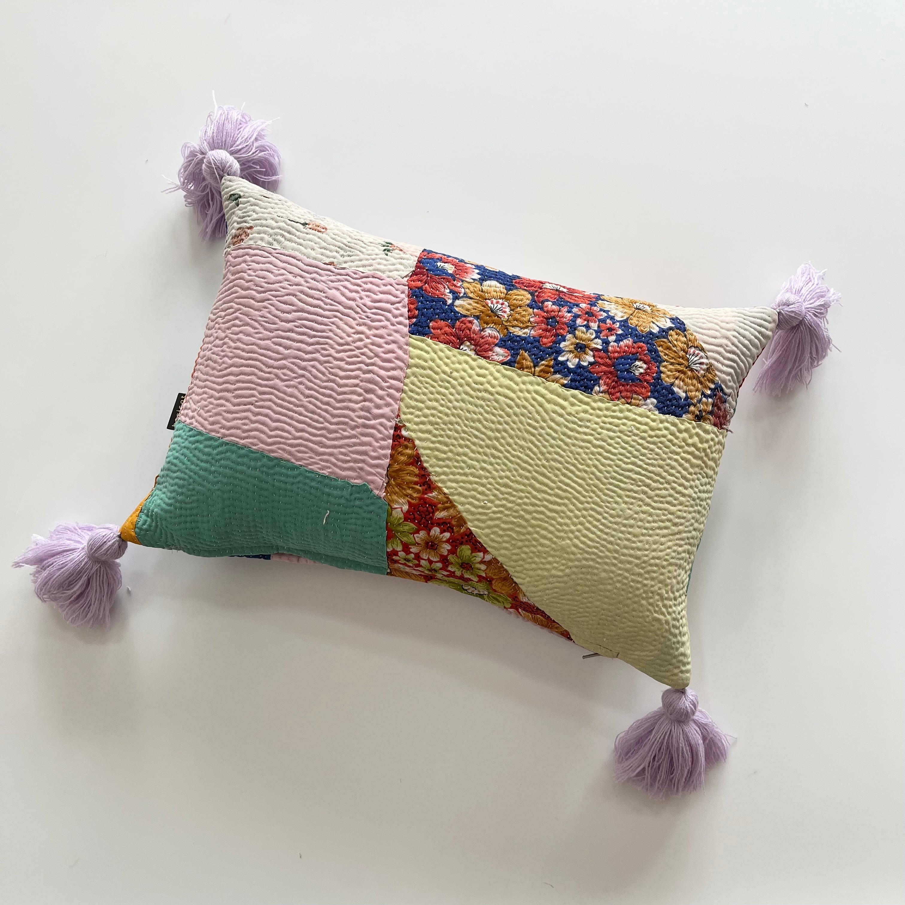 インドで買い付けたヴィンテージラリーキルトをハリコットのアトリエでクッションに仕立てました。